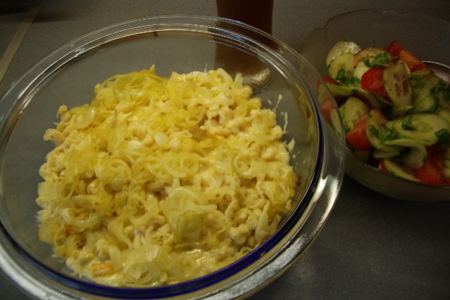 Teig ist, um so größer werden die "Spatzen". In der Zwischenzeit den Emmentaler und den Gouda reiben und gleichmäßig vermischen. Die Zwiebeln halbieren, in dünne Scheiben schneiden und in einer Pfanne in der Margarine anbräunen. Den Teig portionsweise durch ein Spätzlesieb oder einen Spätzlehobel in einen Topf mit leicht kochendem Salzwasser streichen und kurz blanchieren. Die Spatzen sind gut, wenn sie an die Wasseroberfläche steigen. Mit einem Schaumlöffel aus dem Wasser nehmen und in einem Durchschlag (Sieb) abtropfen lassen. In eine eingefetteten Auflaufform abwechselnd jeweils eine sehr dünne Schicht Spatzen, eine Handvoll Käseraspel und ein paar kleine Stücke Weichkäse geben. Abschließend die angebräunten Zwiebelringe darüber verteilen und die Auflaufform für 20 Min. in den vorgeheizten Backofen bei 200 °C, Ober- und Unterhitze, stellen. Dazu passt ein gemischter Salat. |