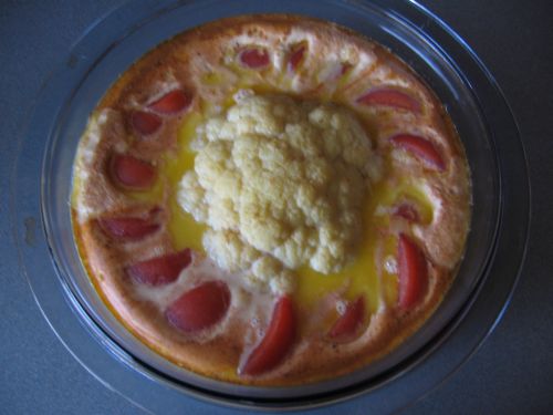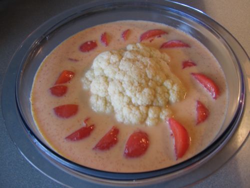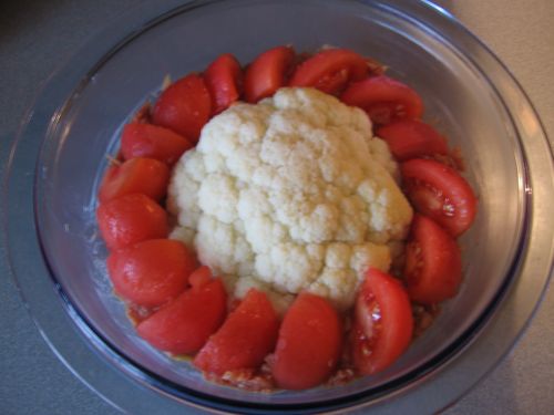 hineinsetzen, das restliche Hackfleisch um den Blumenkohl verteilen und die geviertelten Tomaten in den Hackfleischteig