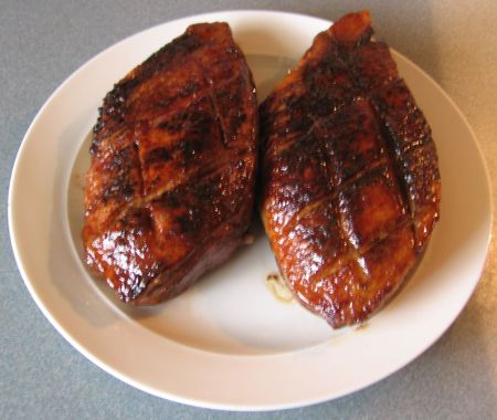 2 - 3 Entenbrüste, zusammen ca. 900g Einfache Marinade: 1 - 2 EL Sojasoße 1 - 2 EL Grenadine je eine gute Prise Anis, Pfeffer,Cayennepfeffer, Chinagewürz, Kardamon eine kleine Prise 5-Gewürz-Pulver oder Pikante Marinade: Zutaten und Zubereitung siehe Rezept Marinade für Entenbrust Für die Soße: ausgetretenes Entenfett vom Anbraten 400 ml Entenfond 1 Päckchen Instant-Bratensoße, z.B. Bratensoße Extra von Knorr ca. 100 ml kaltes Wasser 2 gehäufte TL Mehl Saft einer sehr großen Orange 1 kräftiger Schuss trockener Sherry je 1 gute Prise Pfeffer, Cayennepfeffer, Curry, Kardamon, Chinagewürz eine kleine Prise 5-Gewürz-Pulver etwas Salz der beim Grillen ausgetretene Fleischsaft oder spezielle Orangensoße: Zutaten und Zubereitung siehe Rezept Orangensoße zu Entenbrust Beilage: Sehr gut passen Knödel, z.B. Serviettenknödel und Rotkohl |
