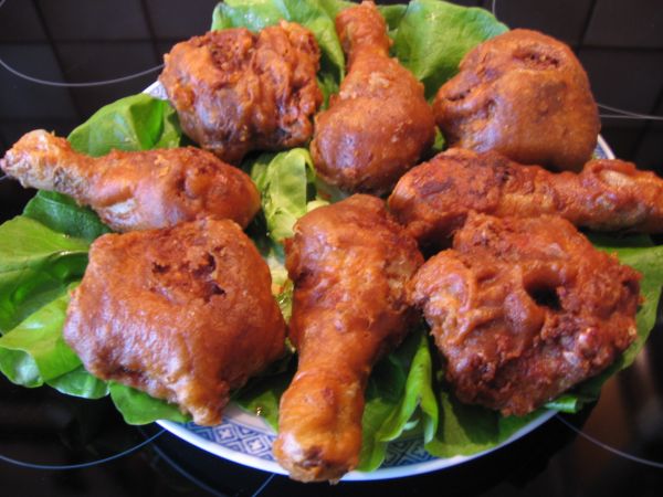 Die Backzeit für die Beine beträgt ca. 15 - 20 Min. je nach Größe der Beine. Pro Frittiergang nur 4 Hähnchenteile in die Frtteuse geben. Da durch den Teig die Hähnchenbeine leicht zusammenbacken, sie nach den ersten 5 Min. voneinander lösen. Hierzu passt sehr gut eine süße Chilisoße. | ||