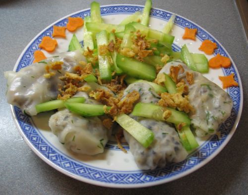 Servir 1/2 pepino para ensalada, en rodajas y después hacer tiras de las rodajas 1 puñado de brotes de soja menta fresca cebollas tostadas Adicional al gusto: unas rodajas de Cha Lua, en tiras (salchicha vietnamita de carne de cerdo), unos chalotes marinados a la vietnamita cilantro fresco |