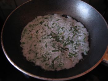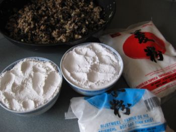 Mezclar bien todos los ingredientes para la pasta y dejarla que suba durante media hora.. IMPORTANTE: Para las harinas y el agua ser muy exactos con las medidas indicadas! Echar en una sartén antiadherente muy pequeña, muy caliente y ligeramente untada en aceite (puede hacerse con un pincel de cocina) la cantidad de masa necesaria para cubrir el fondo de la sartén, intentando que quede fina la tortilla. Tapar la sartén y calentar a fuego fuerte la masa durante unos segundos. Desprender la tortilla en un plato de porcelana también untado en un poco de aceite para que no se pegue. Por la elevada temperatura las harinas liberan gluten en la parte inferior de la tortilla. Después de desprender la tortilla esta parte tiene que estar arriba para que no se pegue en el plato (o sea, al desprenderla de la sartén que quede la cara cocida hacia arriba). Poner 1 cucharada del relleno salteado en el centro y enrollar los lados de manera que se forme un rollito (o una bolsita). Ir poniendo todos los rollitos ya preparados con el pliegue hacia abajo en otro plato untado ligeramente con aceite para que no se peguen uno al lado del otro. ATENCIÓN: Antes de freír una nueva tortilla es importante remover bien la pasta. | ||||