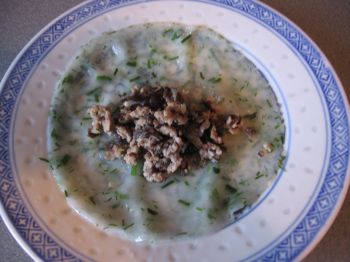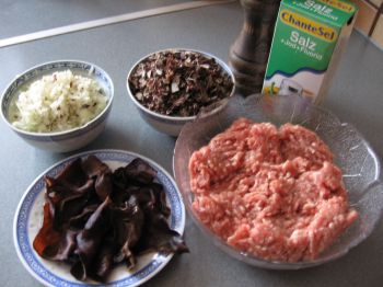 | 500 g de carne de cerdo picada 50 g de setas chinas secas (mu-err) 2 cebollas medianas 2 - 3 cucharadas de aceite 2 cucharaditas de sal bastante pimienta 1 cucharadita de azúcar |
