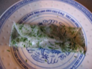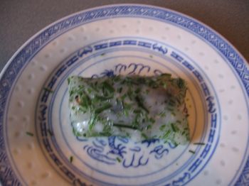 Aderezar 4 - 5 bánh cuôns en un plato, echar la guarnición y 3 - 4 cucharadas de la salsa sobre los rollitos. Por último añadir las cebollas tostadas. |