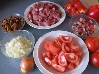 Vom Fleisch das Fett entfernen und das Fleisch in Würfel schneiden (etwa 3 cm Kantenlänge). Vom Speck die Schwarte