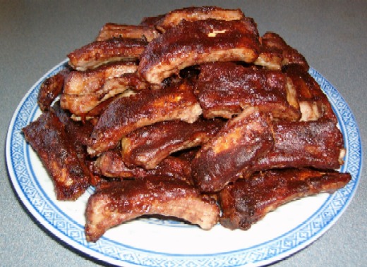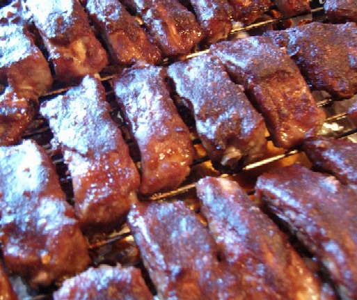 Die Rippchen auf der Fleischseite gut damit bestreichen und ca. 2 Std. marinieren. Die Rippchen mit der Knochenseite nach unten auf ein Grillrost legen und eine Fettpfanne drunterschieben. Im Backofen bei ca. 150 - 160 °C 45 - 60 Min. (je nach Fleischdicke) garen. Dabei etwa alle 15 Min. mit der Marinade bepinseln. Wenn der Backofen die Umluftgrill-Funktion besitzt, ist diese zu wählen, der Backofen braucht in diesem Fall nicht vorgeheizt zu werden. Sonst Umluft benutzen, dann aber den Backofen erst vorheizen. Wenn die Rippchen sehr dunkel werden, die Temperatur etwas zurücknehmen (um 5 - 10 °C), die dunkle Farbe wird durch den Zucker und Honig verursacht. |