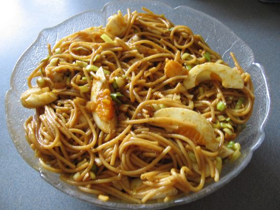 Zwiebelwürfeln und die Lauchscheiben in die Soße geben und alles 10 Min. ziehen lassen. Dann die Soße durch ein Sieb